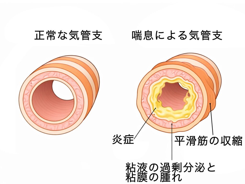 気管支喘息は、何らかの原因により気道に慢性的な炎症が続き、粘膜が腫れ粘液が過剰分泌されることで気道が常時狭くなりやすくなります。さらに気道を取り囲む筋肉(平滑筋)が発作的に収縮することで気道が狭くなり喘息発作が起こります。