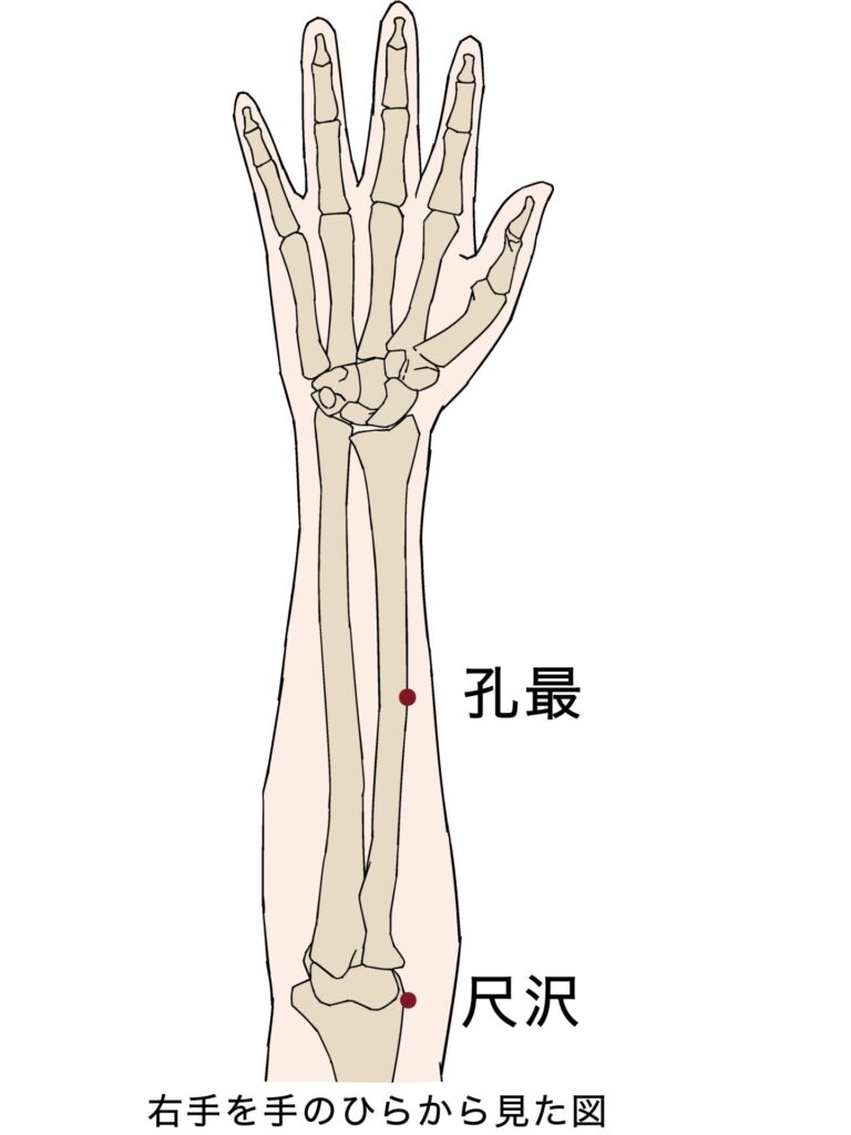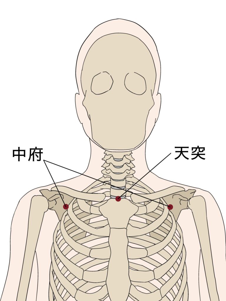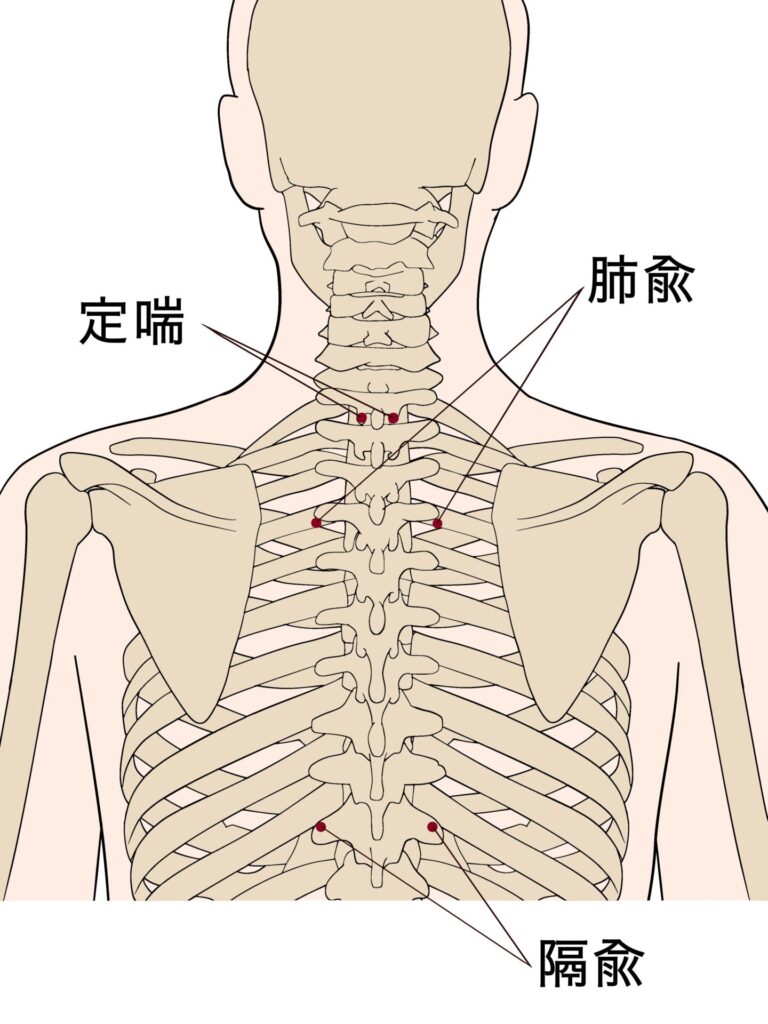 では、鍼灸治療でよく使う経穴(ツボ)を紹介していきます。「肺兪(はいゆ)」、「膈兪(かくゆ)」、「定喘(ていぜん)」「天突(てんとつ)」、「中府(ちゅうふ)」、「尺沢(しゃくたく)」、「孔最(こうさい)」などがあります。