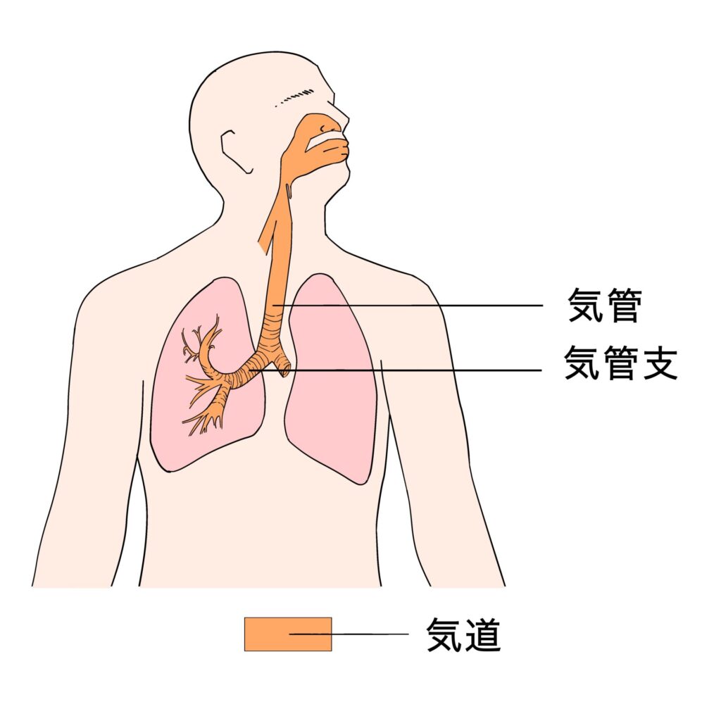 「気道」や「気管」、「気管支」など言い方を使い分けていますが、それぞれ場所が異なります。簡単なイラストにしたので、ご覧ください。