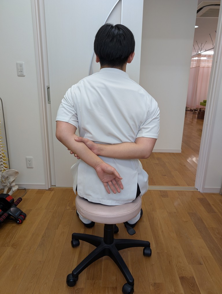 ②腕を内側にゆっくり引っ張ります。肩甲骨を背骨に近づけるイメージで。