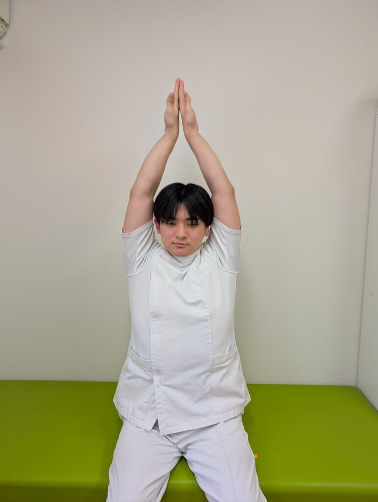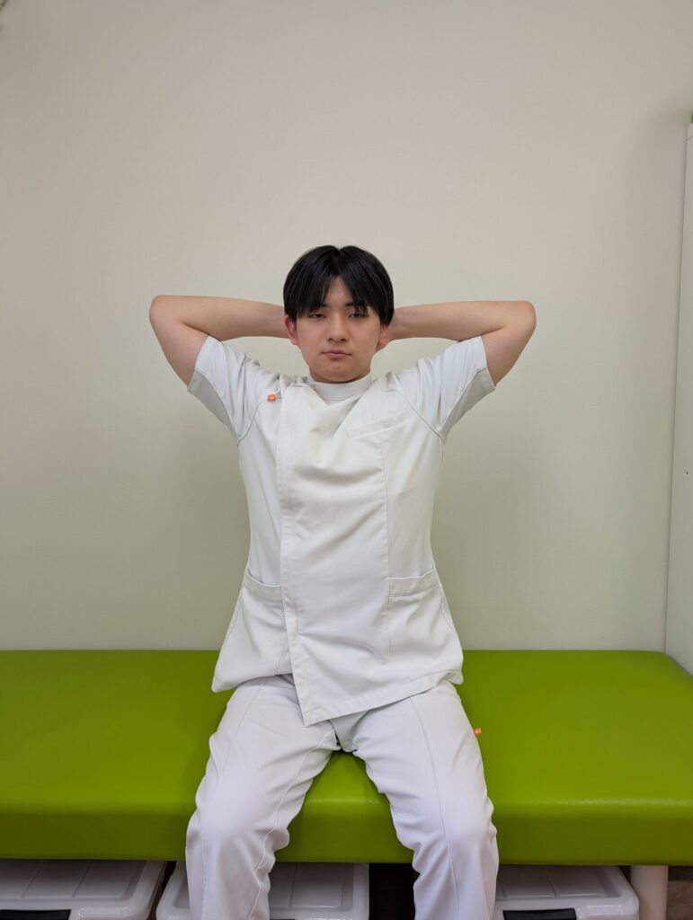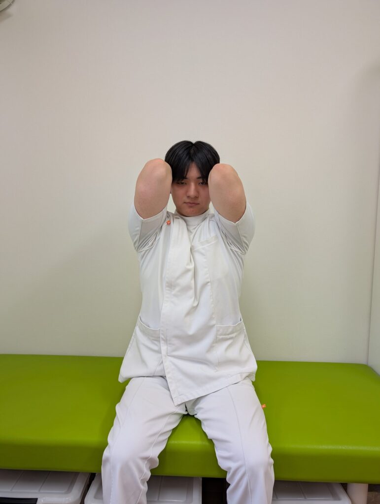 ①頭の後ろで手を組みます。肩甲骨を背骨から左右に遠ざけるイメージで。