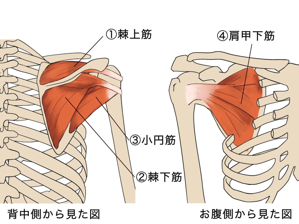 ローテーターカフは①棘上筋、②棘下筋、③小円筋、④肩甲下筋で構成されます。