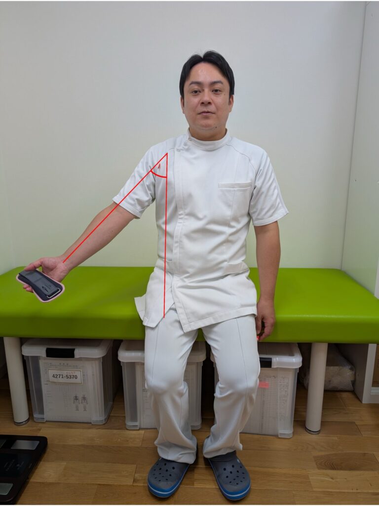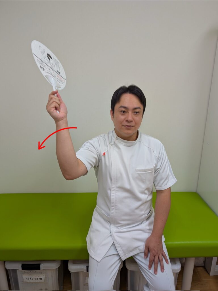 ②親指を上に向けて、身体の斜め前で持ち上げます。
