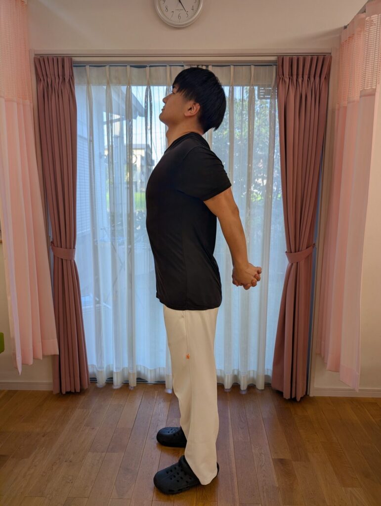 ①スタートポジション、②できるだけ両手を後ろへ体から引き離す。
